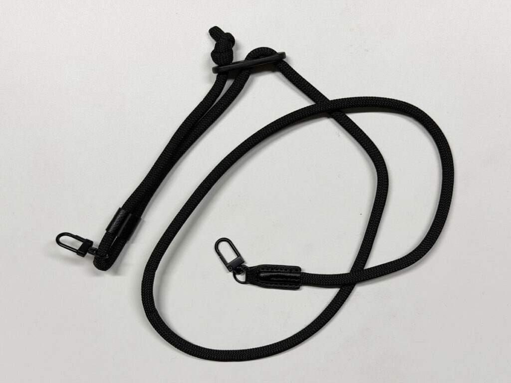 このポーチを普段使いにしたい私は、以前のポーチで使っていたエレコムのスマホショルダーストラップ 丸紐を使用しています。