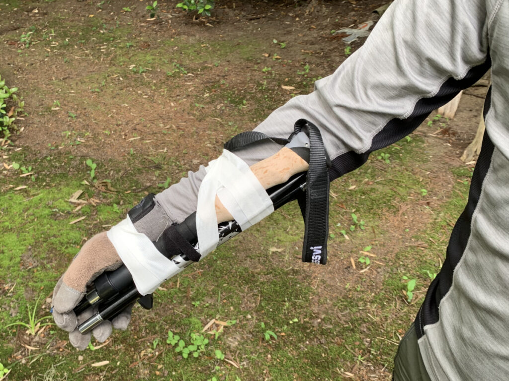 トレッキングポールでの添え木は、がっちり固定されて多少振り回したくらいでは痛みを感じませんでしたよ。